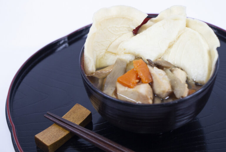 小麦粉(こむぎこ)で作られた南部(なんぶ)せんべいを(やわ)らかく食べるために(なべ)に入れたのが由来(ゆらい)となっている