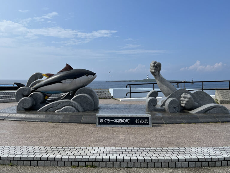 大間町はこのような石像(せきぞう)設置(せっち)されるほど、まぐろが有名
