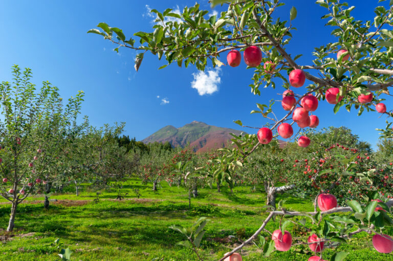 青森県(あおもりけん)といえば、と言われて最初(さいしょ)に思い()かべる人も多いかもしれません。日本でとれるりんごの(やく)6(わり)青森県(あおもりけん)(さん)です。「ふじ」や「つがる」など人気の品種(ひんしゅ)がたくさんあります。