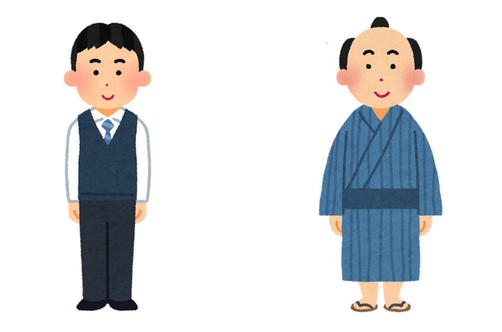 日本(にほん)の今(いま)と昔(むかし)を見(み)てみましょう。今(いま)は洋服(ようふく)を着(き)ます。昔(むかし)は …? ちがうこと、同(おな)じことは何(なん)でしょう!?